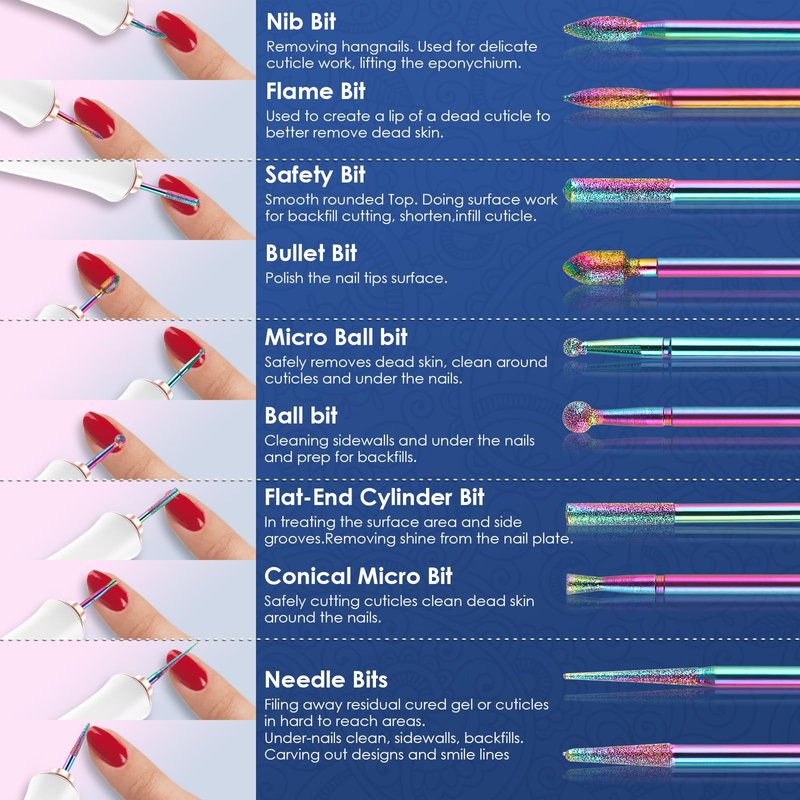 - MEET ALL YOUR NEED: This drill bit set is not just useful for drill nails, but also for polishing. You can easily use them to clean cuticles and acrylic, refine and shape nail edges, and remove dead skin. Ensures you can get the kinds of finish in the nail art you want. It also makes a perfect gift due to its storage design. It is an ideal present for your loved ones, including moms, wives, girlfriends, and friends.