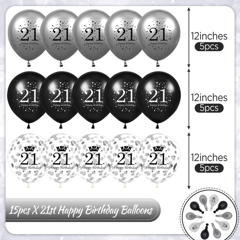 - 🍰HAPPY BIRTHDAY BALLOONS DECORATIONS:Add a pop of color to someone’s 21ST birthday celebration with our vibrant party balloons. Available in several color options, there are 15pcs colorful print balloons (5 black birthday balloons,5 Silver birthday balloons,5 birthday balloons with clear silver sequins)you're sure to find the perfect match for your party decor.