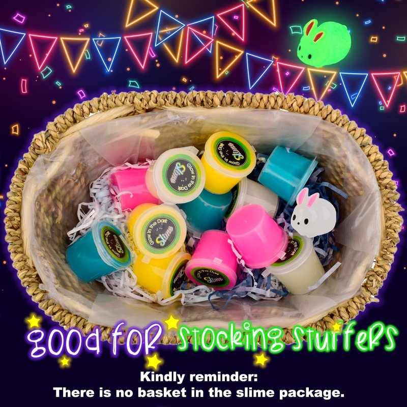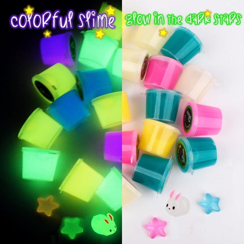 22 Pack Galaxy Slime Set Glow in the Dark Watery Slime Party Favors for Kids Toys Fun Slime Christmas Toys for Boys Girls ♥ Great toys for kids' christmas stocking fillers/stuffers, easter toy list, party favors, Halloween, Children's Day, Kids' Birthday, Family Activities, School Funny Projetcs. ✔ This 22 pack galaxy slime kit contains 4 colours of glow-in-the-dark galaxy slime(green*6+blue*6+orange*6+red*4=22Pack) and 4 colors of glow-in-the-dark star charms(green, orange, blue, pink) & 1 rabbit charm glow in the dark. Take them out during the day to absorb enough light and they will glow dazzlingly bright at night in dark environment. It's like a few stars shining in the night sky. ◆The galaxy slime like flowing gel. You can knead/rub/pull/squeeze/pat as much as you want without residue. Can even be used to stick dust on computers/windows/desks/chairs/floors/corners when you don't need them anymore! ⚠CHOKING HAZARD-small parts. Not for children under 5 years old. Playing under adult supervision