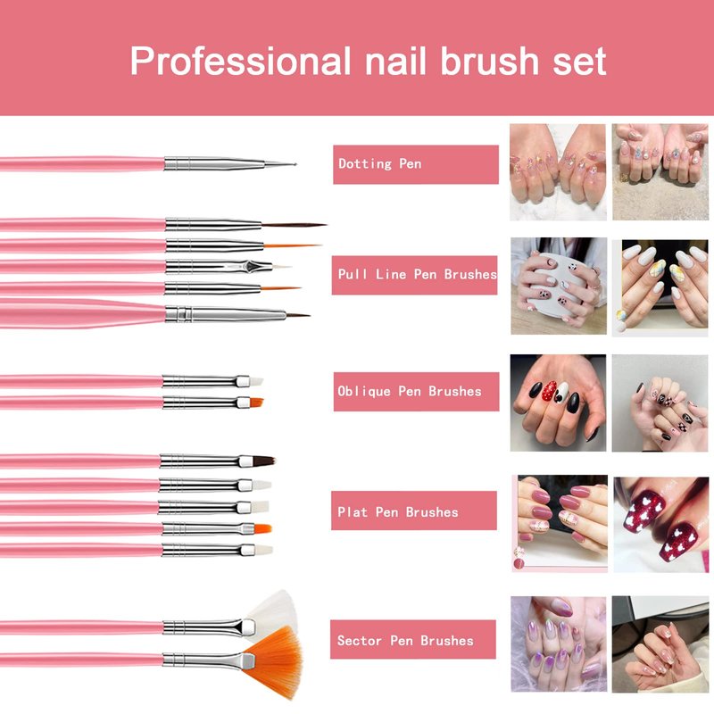 15pcs brushes contain dotting pen brush, drawing pen brushes, plat pen brushes, oblique pen brushes, sector pen brushes, pull line pen brushes.
