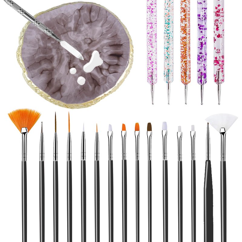 Quantity: 1 resin palette, 5 dotting pens, 15 nail design brushes,1 Makeup Spatula Stirring Rod