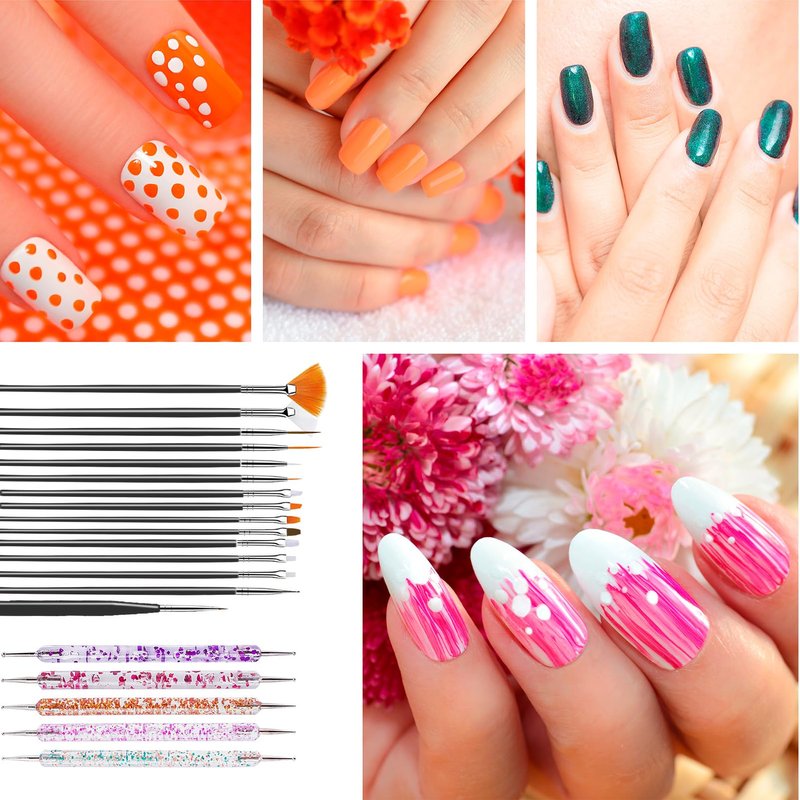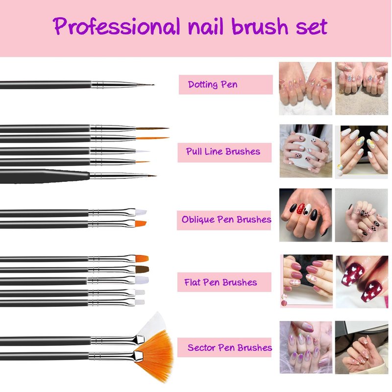 - ❤【Brushes of Various Sizes】2 sector fan brushes, 5 liner brushes, 1 dotting pen brush, 5 flat brushes, 2 oblique brushes. Cover the range of brushes you'll need, different brushes for different functions.Ideal for drawing thin fine lines, painting flowers and pattern design on nail tips.