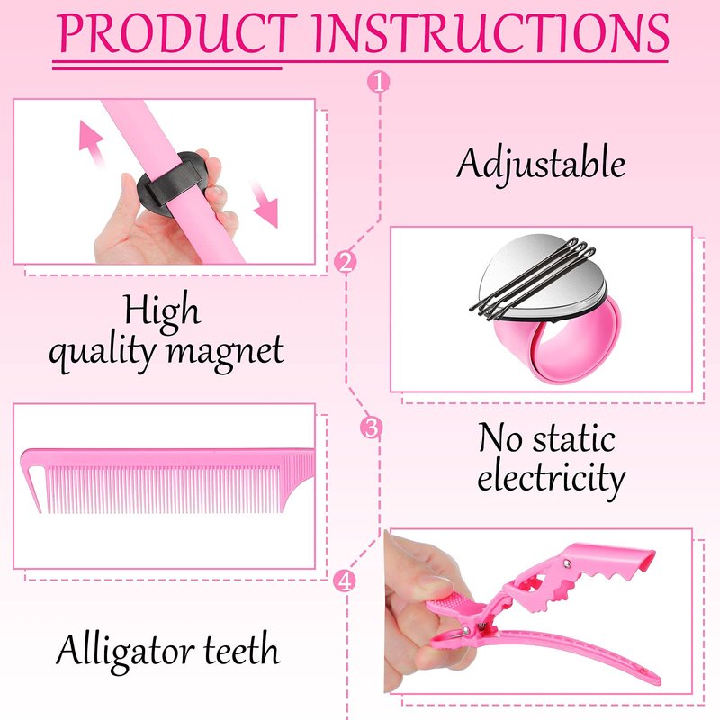 22 Pieces Magnetic Wrist Sewing Pincushion Hair Braiding Tools Pin Wristband Stainless Steel Pintail Rat Tail Comb Wide Teeth Alligator Sectioning Hair Clip Hair Parting Ring Tool for Hair (Pink)