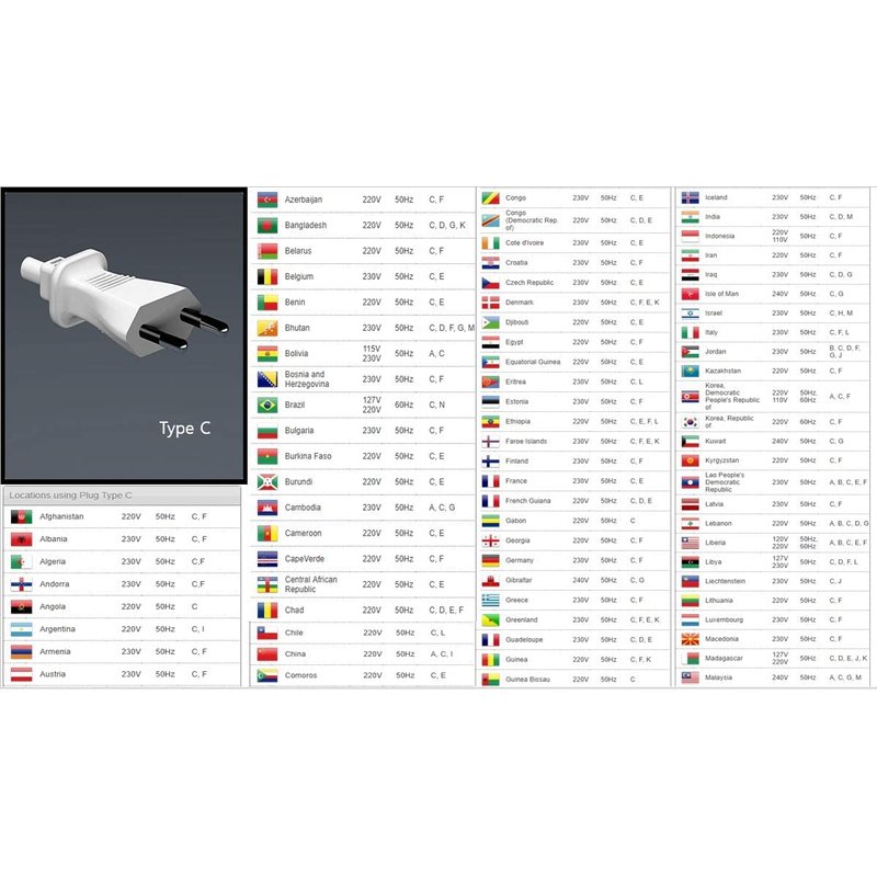 - Plug type C : Used in: Europe, with the exception of the UK, Ireland, Cyprus and Malta . The Type C electrical plug (or Europlug) is a two-wire plug that has two round pins. It fits into any socket that accepts 4.0 – 4.8 mm round contacts on 19 mm centres. They are being replaced by E, F, J, K or N sockets which work perfectly with Type C plugs.