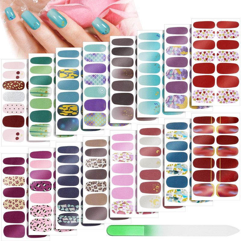 - What you receive: you will get 1 piece of nail file and 16 sheets of nail art polish stickers in various colors and styles, each sheet accounts for 14 pieces nail art decals in different sizes, totally 224 pieces, enough to fit most people's fingers and allow you to design a variety of styles of nail art works