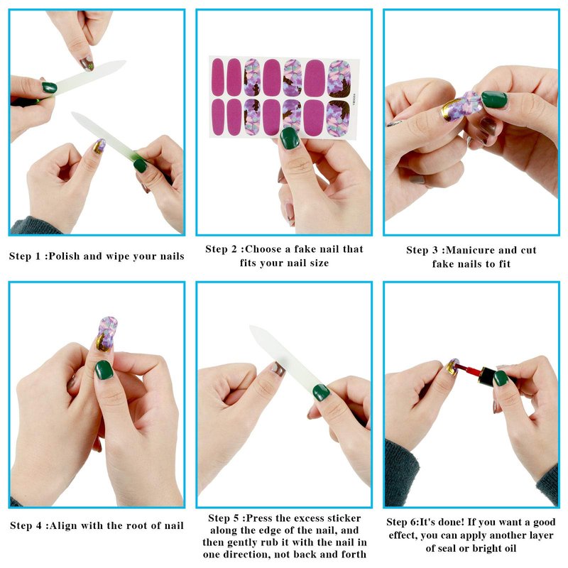 These nail decals are self-adhesive, you just need to apply the suitable nail decal directly to your nail and trim it to fit your nail well, finally use the nail file to file the edges gently to make it smooth.
