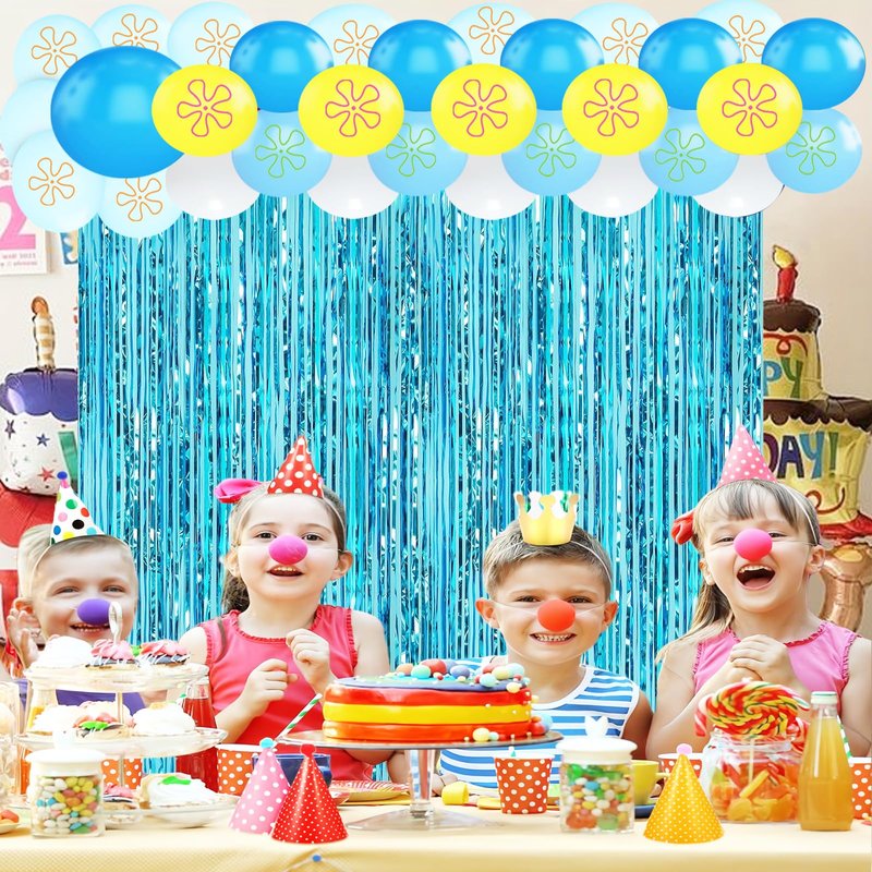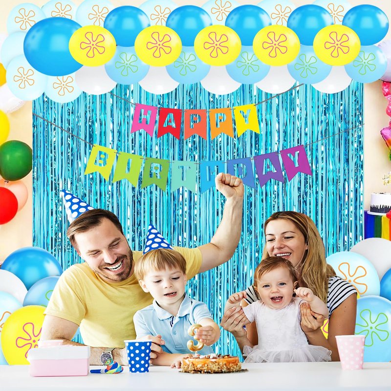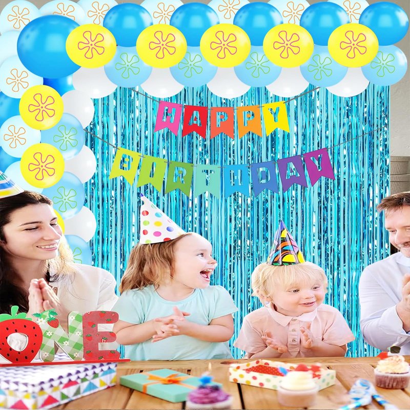 22Pcs Cartoon Baby Birthday Decorations, Aquamarine 3.3x8.2ft Tinsel Foil Fringe Curtains Banner and Cute Flowers Bubbles Balloons for Cute Theme Party Decorations Boys and Girls Party Supplies