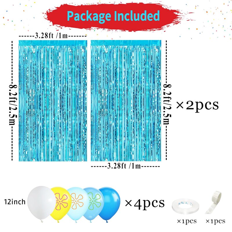 - 【Cartoon Baby Theme Tinsel Foil Fringe Curtains】2 pack Aquamarine tinsel foil fringe curtains banners, extra large size (width x drop) 3.3 x 8.2 ft, 20 pcs cute printing pattern latex balloons latex balloons(12 in), 1 roll glue dots, 1 roll ribbon