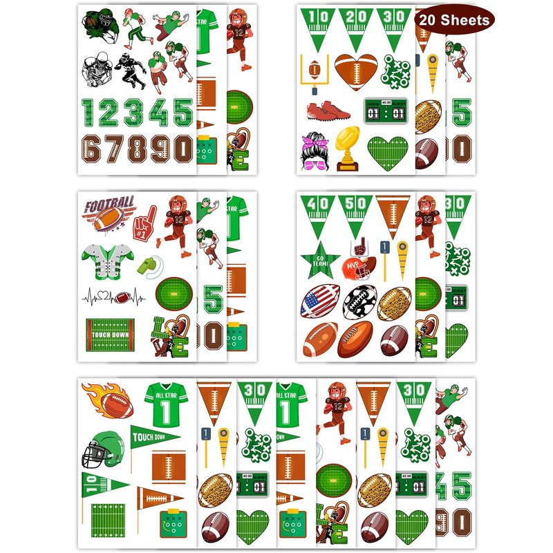 - Green and Brown Football party decorations Package includes 232 pieces of Football themed temporary tattoos, which can be used wherever you want, such as arms, face, and hands