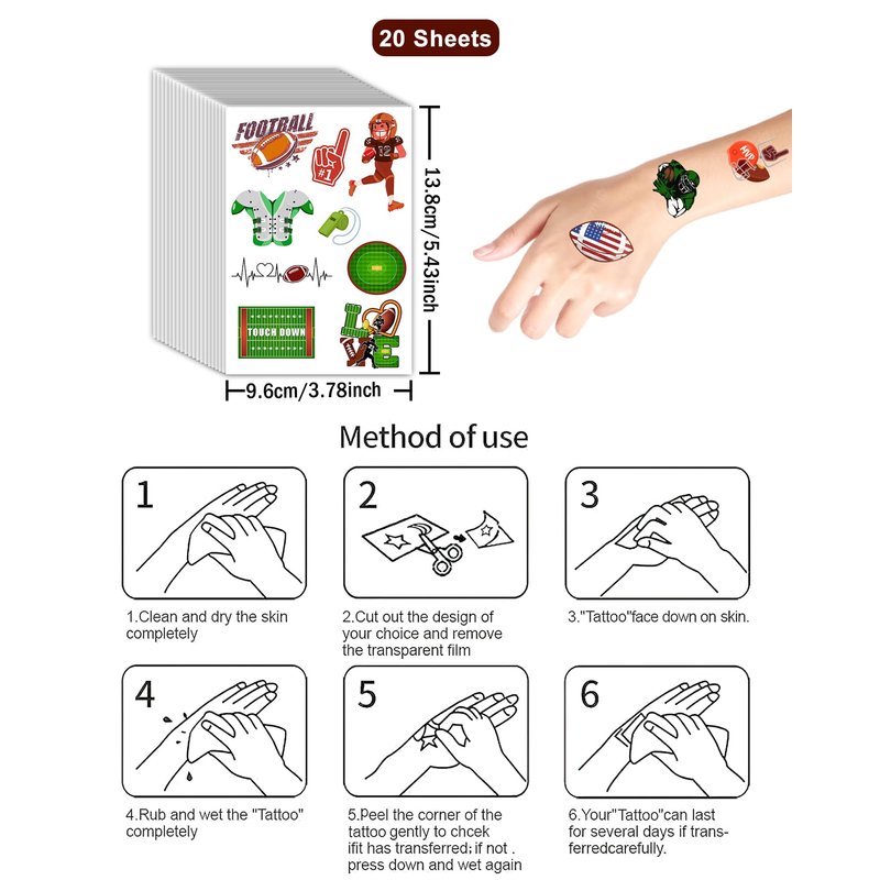 - Easy to Use Football temporary tattoos, Cut out the desired motif,remove the plastic covering film of Gameday temporary tattoo,then stick the tattoo face down on the clean and tidy skin,wet the tattoo with water,gently pat and press for about 30 seconds,then tear off the paper