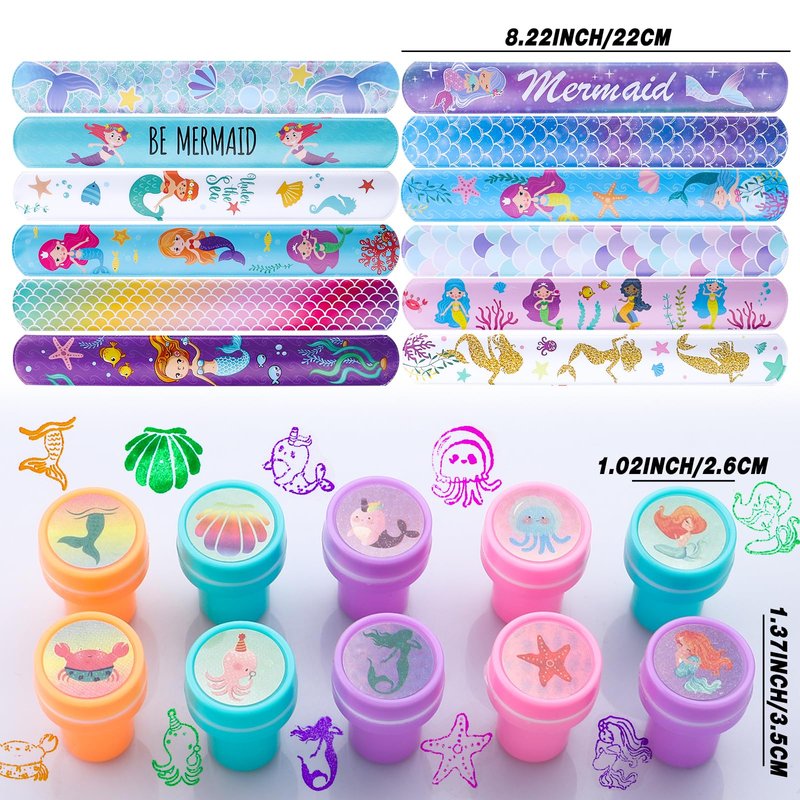 - Mermaid Party Supplies - Included 12pcs cups with lids, 12pcs Mermaid straws, 12pcs Mermaid rings, 12pcs Mermaid keychains, 12pcs Mermaid hair clips, 12pcs Mermaid hair rings, 12pcs Mermaid slap bracelets, 12pcs Mermaid stampers, 12 Sheet Tattoo, 100pcs Stickers, 12pcs face stickers, 12pcs Mermaid scratch art, and 100pcs sticker, sufficient quantity for kids birthday party favors.