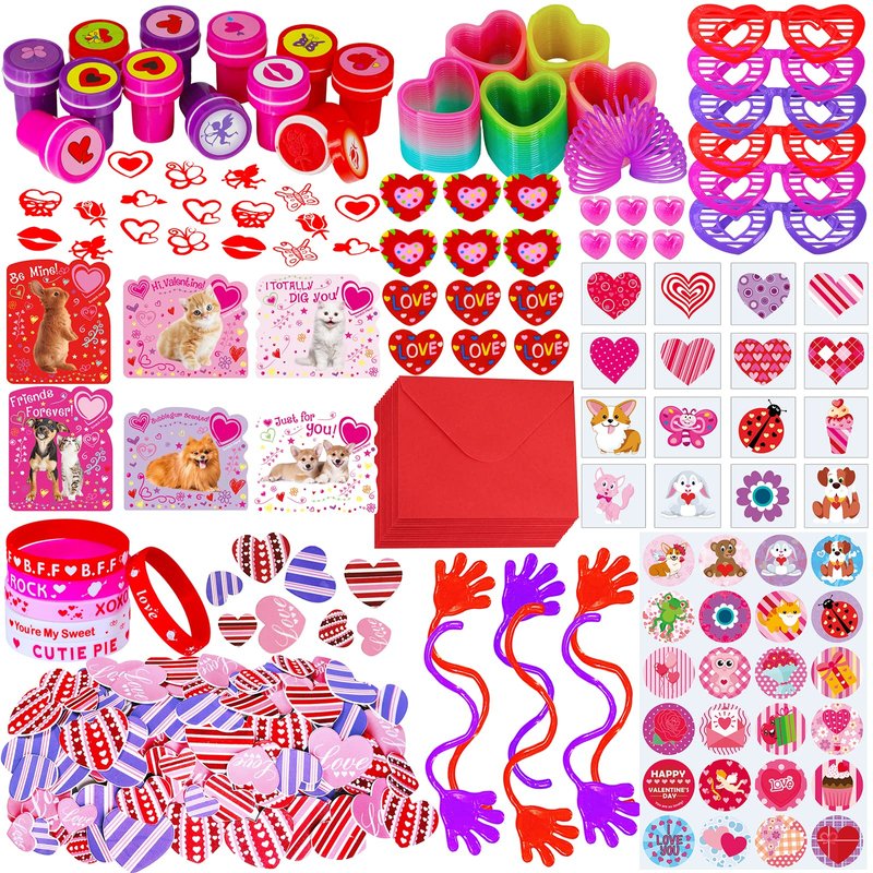 - 234 Pack Valentine's Day Party Favors Supplies Stationery Toy Assortment includes 120 PCS Foam Heart Stickers, 6 Sheets Valentine Stickers (144 Pcs), 6 Sheets Valentine Temporary Tattoos (96 PCS), 12 PCS Valentine Stampers, 24 PCS Valentine Cards, 24 PCS Envelopes, 12 PCS Heart Shape Erasers, 6 PCS Valentine Rubber Wristband Bracelets, 6 PCS Heart Shape Glasses, 6 PCS Heart Shape Rings, 6 PCS Sticky Hands and 6 PCS Heart Shape Coil Springs.