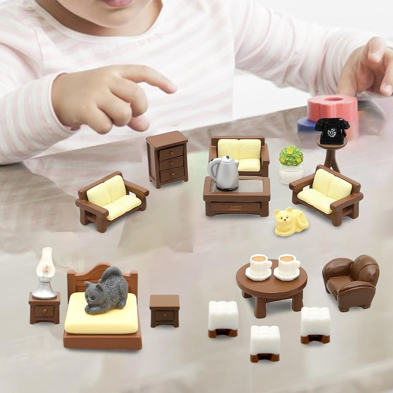 - Age Warning: CHOKING HAZARD - Small Parts. Not for children under 3 years. Develop Their Imagination: The mini furniture set is a delightful gift for boys and girls, developing kids' imaginary cognitive skills and story-telling skills. The kids toys enable toddlers to enjoy great fun with their family and friends. Age Warning: 8+.