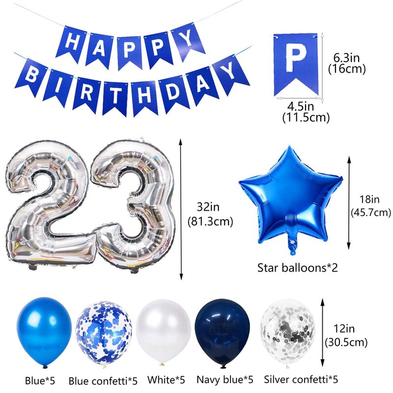 - 23rd Silver Blue Birthday Decorations Blue Sets Include: 1 * blue 'HAPPY BIRTHDAY' Letter Banner, 1* Jumbo 23 number foil balloons, 2* star foil balloons, 25 latex party balloons in 5 styles(5* blue color, 5* white confetti, 5* white, 5* navy blue, 5* blue confetti), 1* 10m ribbon. Total 31packs in one package.
