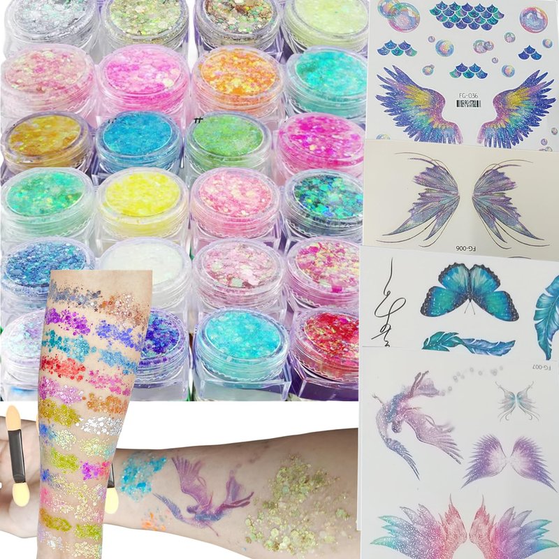 - 【GOOD PRICE】Glitter tattoo set with 24 colors glitter gel, 4 brushes and more than 34 temporary tattoos. The temporary flash tattoo set offers you more choices and more creative fun