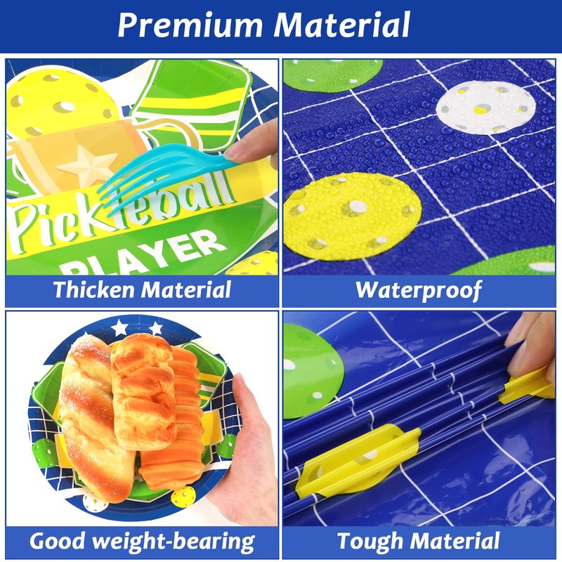 - Premium Quality: Our pickleball party disposable plates are made of quality paper, no smell, non-toxic and sturdy, napkin are soft and absorbent, plastic tablecloths are well printed and waterproof.