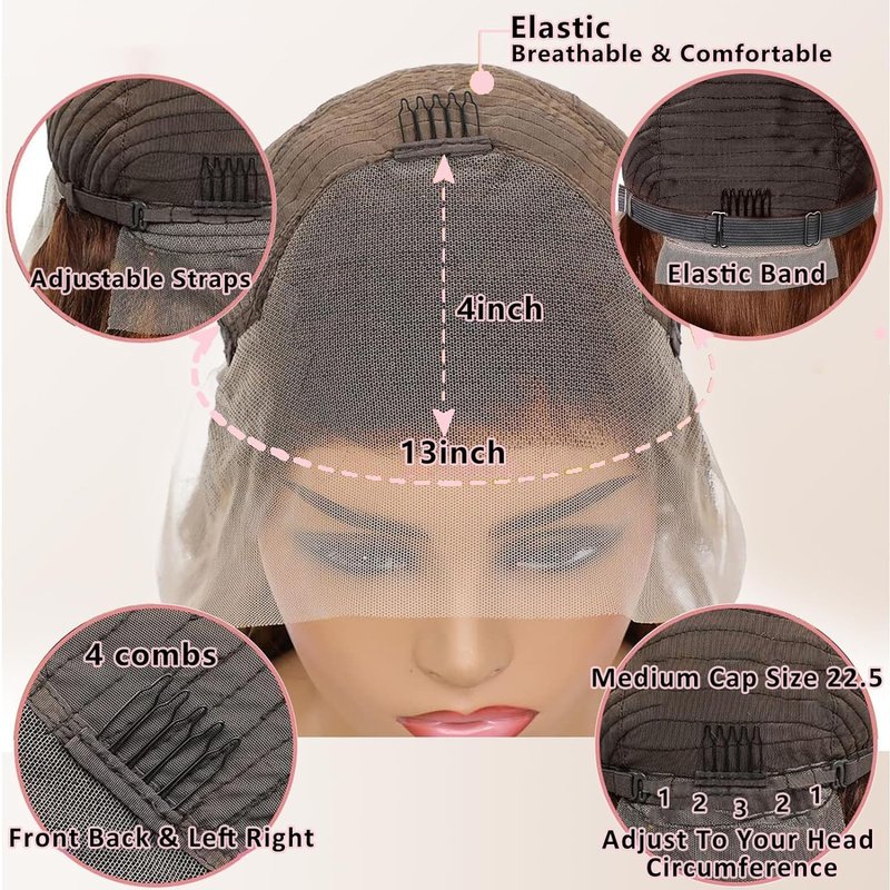 - 【Brown Straight Wigs Human Hair Cap Details】: 13x4 Chocolate Brown Lace Frontal Wig,16-28 Inch Available in Stock, 150% Density Brazilian Lace Frontal Closure Wigs Human Hair. Medium cap size(22 inch - 22.5 inch), with 4 Combs and Adjustable Straps Make it Fit Most People and Easier to Install and Wear.