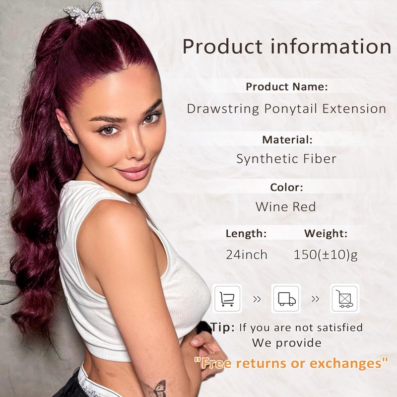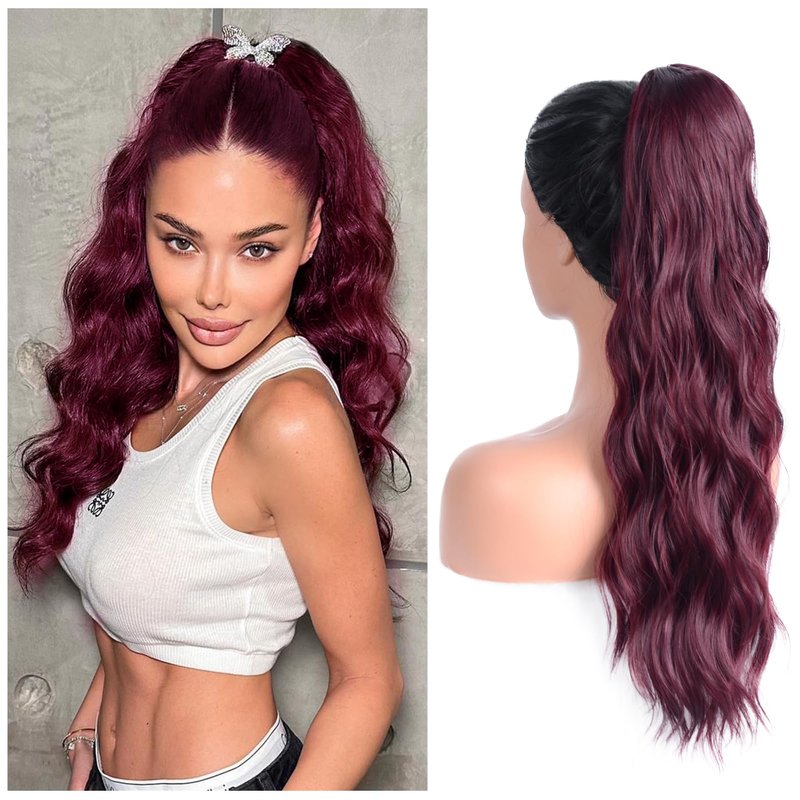 24 Inch Ponytail Extension Drawstring Pony Tails Hair Extensions Long Curly Wavy Ponytail Hair Extension Natural Synthetic Ponytail Hair Pieces for Women (Wine red)