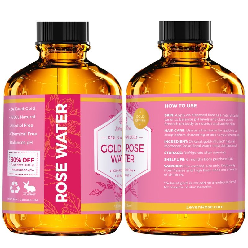 - PURE 24 KARAT GOLD MOROCCAN ROSE WATER - Cleopatra was said to use gold face masks nightly to preserve her beautiful skin. Leven Rose Gold Rose Water is perfect for toning face, neck, décolletage, eye area, dry skin, body and hair for balancing PH, acne prone skin, age spots, dark marks, combination oily skin, and overall balance skin as a botanical astringent and toner. Made from rose flowers and PURE GOLD for a powerful natural toner - natural reducer of redness and a leader in liquid toners.