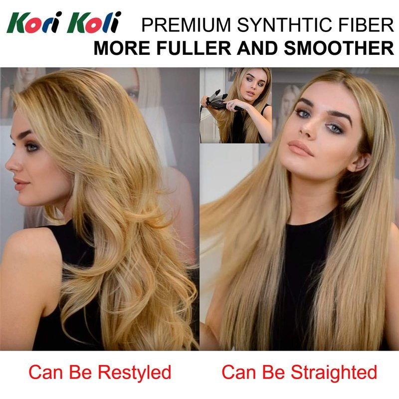 24" Long Straight Wavy Clip in Half Head Tied Wig Blonde Synthetic Hair Extensions For Women 210g 8-22#