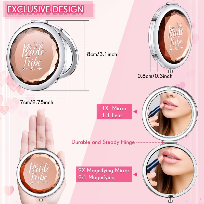 - Compact Mirrors: 2.75 inches in diameter, 0.6 inches in thickness, double sided mirrors, regular and 2X magnifying mirror, the above part is 1:1 lens, the under part is 2:1 magnifying; Material is metal and crystal, we have carved delicate bride patterns on the surface of the mirror; The well designed pattern makes the mirror more eye catching and better expresses the love of the gift giver