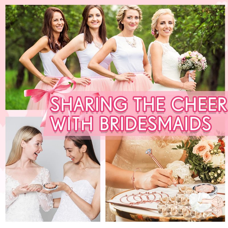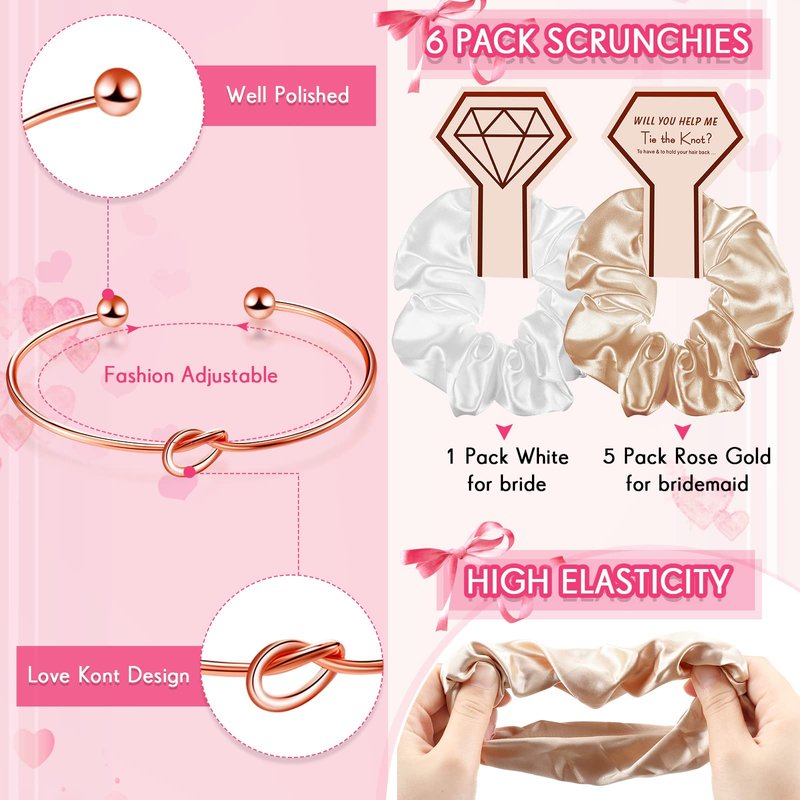 - Complete Bridal Party Gifts: you will receive 6 bridesmaid scrunchies (1 white and 5 champagne), 6 compact mirrors, 6 bridesmaid bracelets and 6 diamond pens; Add them to your gift packages or use them as bridal shower favors, show your appreciation to your bridesmaids; The hair scrunchies are smooth and beautiful and can work well for different hairstyles, which brings people elegant and charming looks