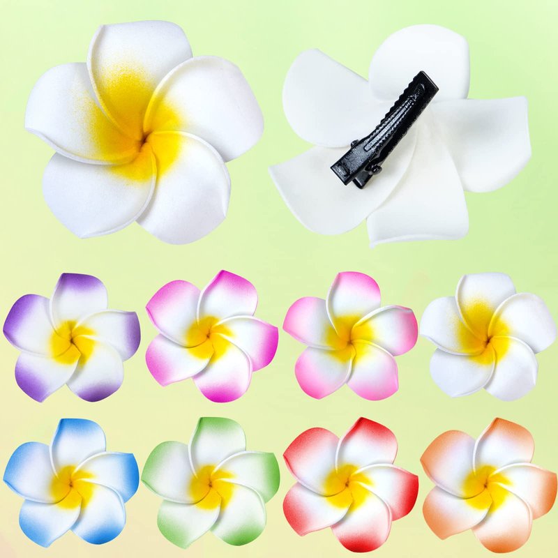 - Bright Color: Our flower hair clips for women includes 24 pieces with eight different colors, red, blue, purple, orange, green, pink, rosy red and yellow; Our Hawaii clips for hair come in different colors but are equally bright