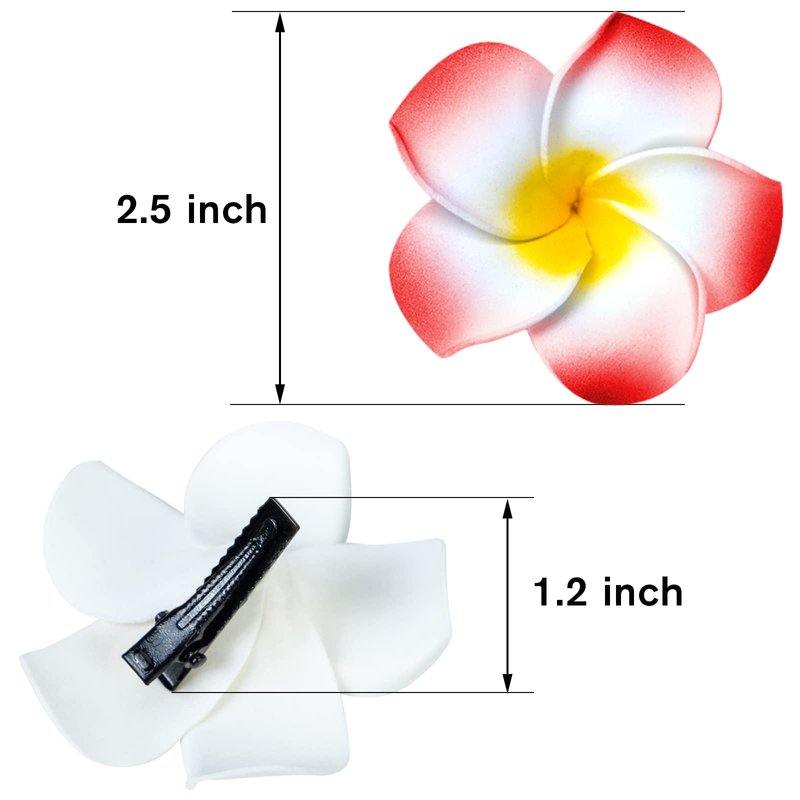 - Size: Hawaiian flower plumeria is 2.5 " wide, great for women, girls; The clip size of barrettes is 1.2 " , which is small but firm and not easy to fall off; If petite bobby pins aren't your thing, you can string them into a garland for a beach party