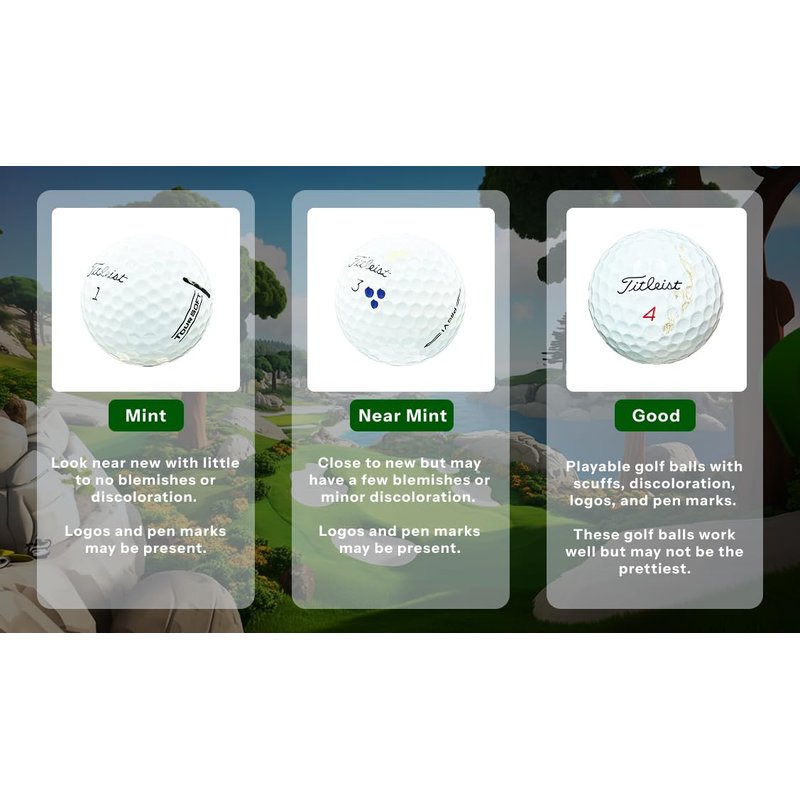 24 Pack of TP5 and TP5X golf balls in "Good" condition. These balls may have blemishes, markings, discoloration, or scuffs. As we like to say, these are the same TP5 balls just for over half the price.