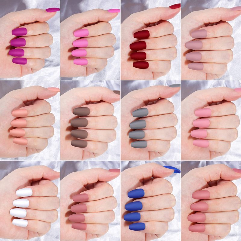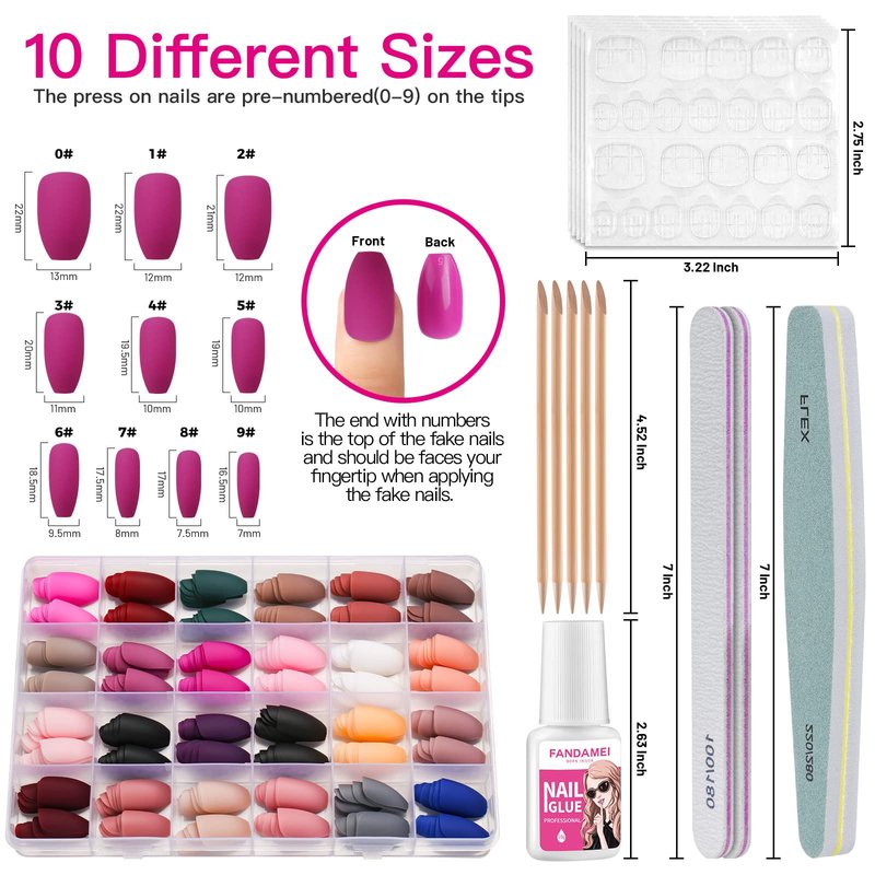 - Package Included: 24 packs 576pcs matte coffin press on nails medium length, 10g nail glue, 5 sheets 120pcs adhesive nail tabs, 5pcs orange nail sticks, 1pcs 220/280 nail file and 2pcs 100/180 nail files. One set includes all tools to wear press on nails. The fake nails are packed in a transparent plastic box with 24 grids. Each grid packed 1 color and 24pcs press on nails in 10 different sizes. Note: 24 grids and 23 matte colors, the classic and elegant black color is repeated and have 48pcs.