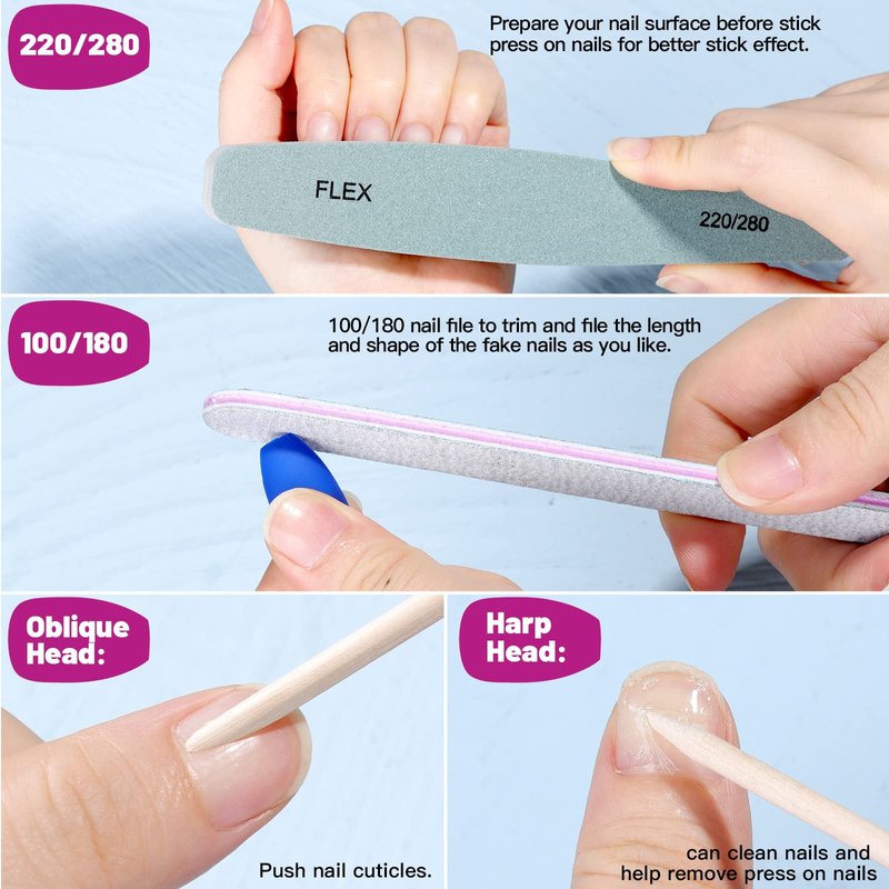 - Useful Manicure Tools: The orange wood nail sticks are double sided. The oblique head is used to push nail cuticles. The sharp head can clean your nails and help remove press on nails. 220/280 nail file helps to prepare your nail surface before stick press on nails and the 100/180 nail file can trim the press on nails to your desired length and shape.