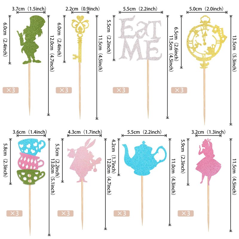 - Wide Usages ! These cupcake toppers are perfect for alice in wonderland theme party, tea party, eat me theme party,baby shower theme party, kids boys girls 1st birthday theme party cupcake decorations, they can make your cupcake more attractive and bring the fun to your party.You can also apply them for ice cream, fruits, cookies and other desserts.