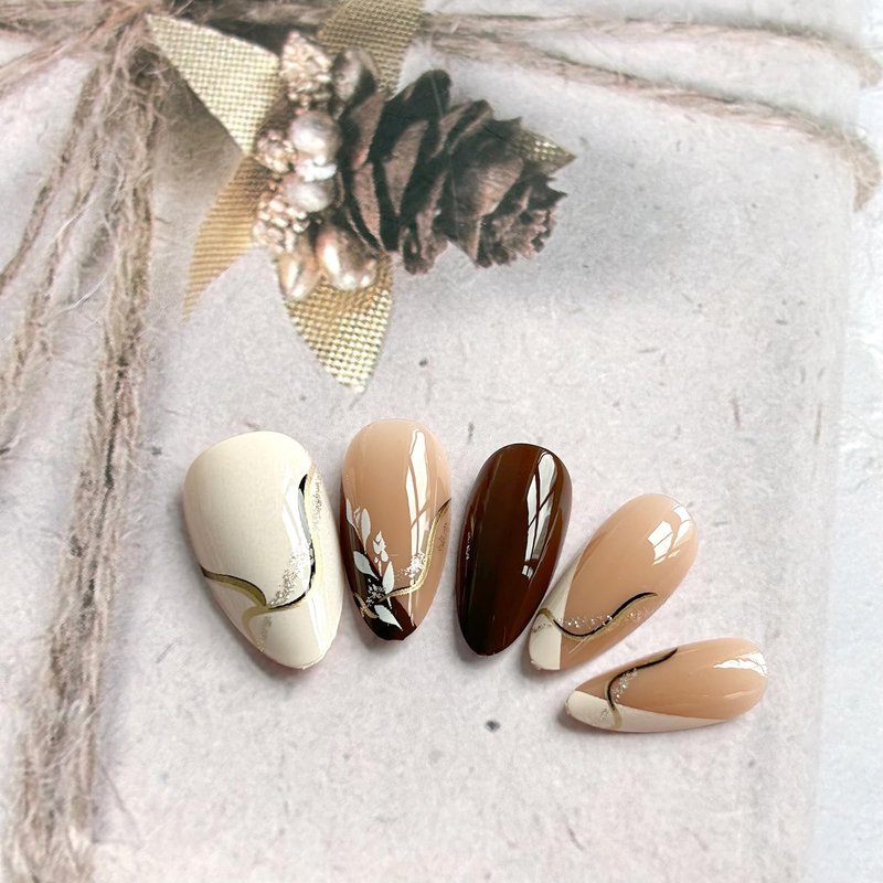 24 Pcs Almond Press on Nails Fall Fake Nails Brown White Medium False Nails with Leaf Designs Full Cover Glossy Acrylic Glue on Nails Autumn Thanksgiving Stick on Nails for Women Manicure DIY