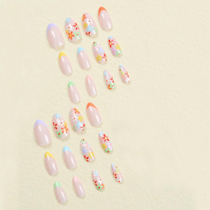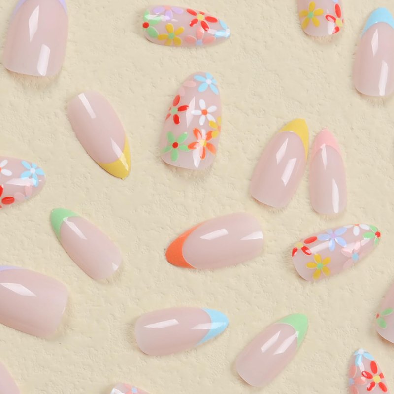 24 Pcs Almond Press on Nails Short Fake Nails French Tip False Nails with Flower Designs Acrylic Glue on Nails Spring Summer Stick on Nails for Women Girls Nail Art