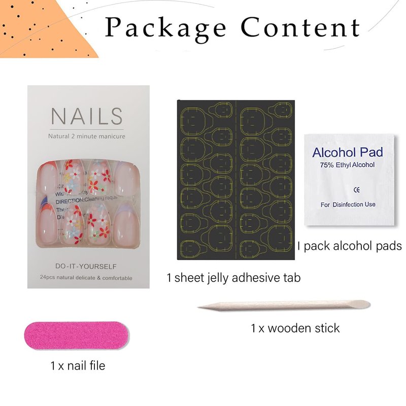 - šćPackagećYou will receive 24 pcs short press on nails ,1 wooden cuticle stick, 1 nail file, 1 sheet double side sticker, and You can decorate it into any shape you want.