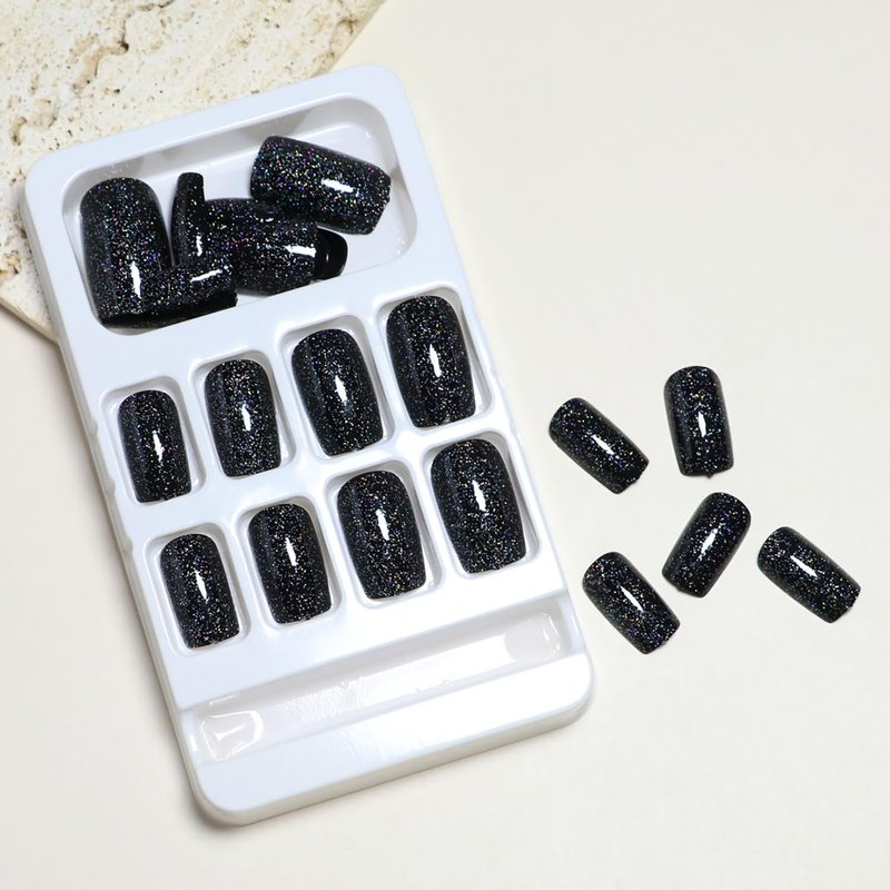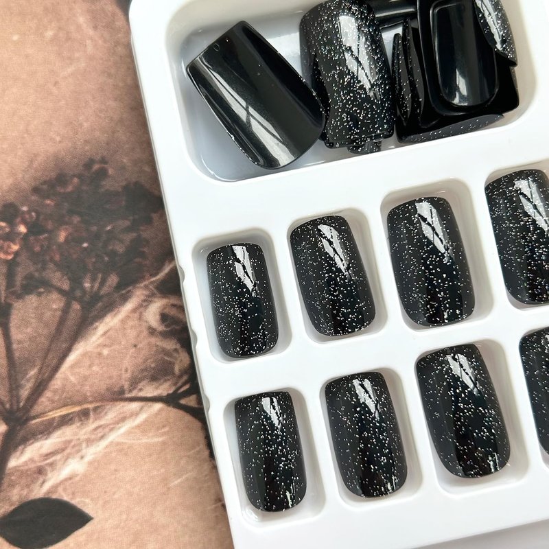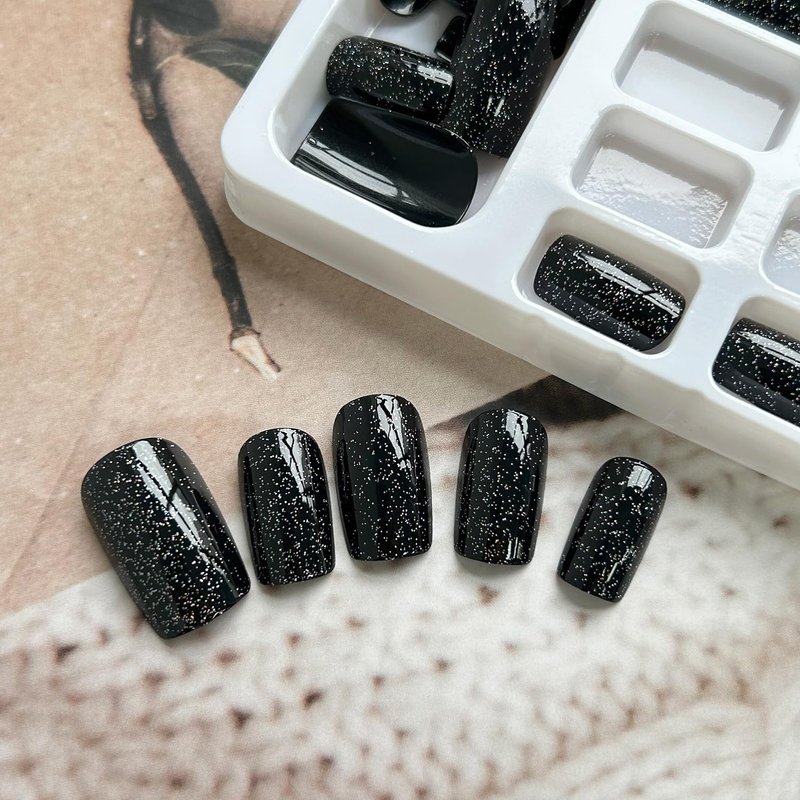24 Pcs Black Press on Nails Square Glitter Fake Nails Glossy Glue on Nails with Nail Glue Natural Full Cover False Nail Tips Medium Stick on Nails Artificial Finger Manicure for Women Girls
