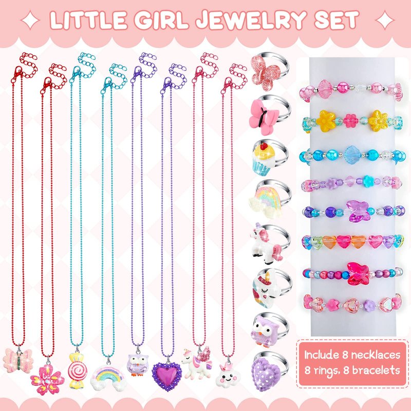 Features: Sweet accessories for girl: With exquisite craftsmanship and diverse styles, this girl jewelry set can easily match your daily outfits and make you more eye catching, leaving a deep impression on others. Wide application: These play jewelry are suitable as novel gifts for your friends, family members and classmates, which also can be applied as classroom prizes, carnival rewards, pinata stuffers, goodie bag fillers and more. Specifications: Color: as shown in pictures Size: as shown in pictures Quantity: 24 pieces Package includes: 8 x Necklaces 8 x Rings 8 x Bracelets Notes: Suitable for people over 12 years old. Please allow slight color difference due to different screen displays. Please allow slight errors on size due to manual measurement.