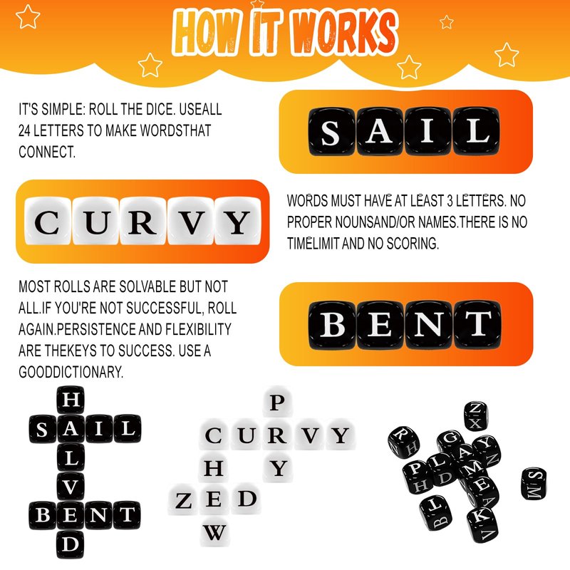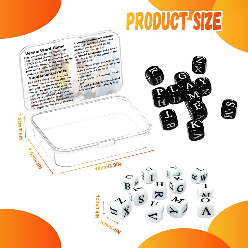 - Dice SIZE:1cm/0.4inch,12 black dice, 12 white dice,Comes with packaging and paper instructions inside,experience the joy of word creation and immerse yourself in the joy of language play with this travel spelling game