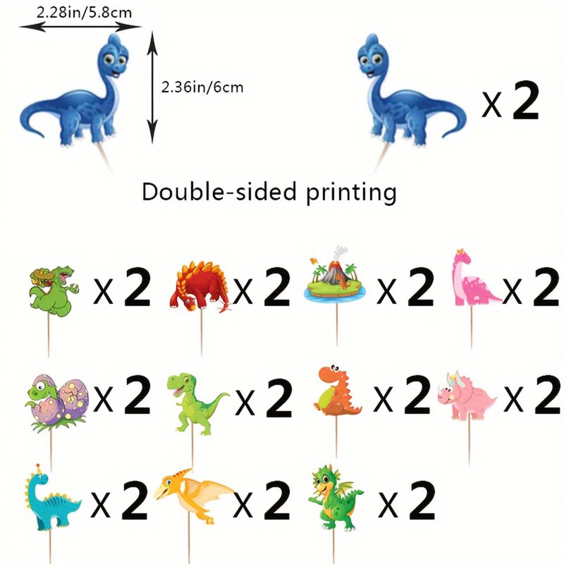 - Double-sided printing: 12 pattern designs, two pieces each dinosaur cupcake toppers, enough for your party needs.