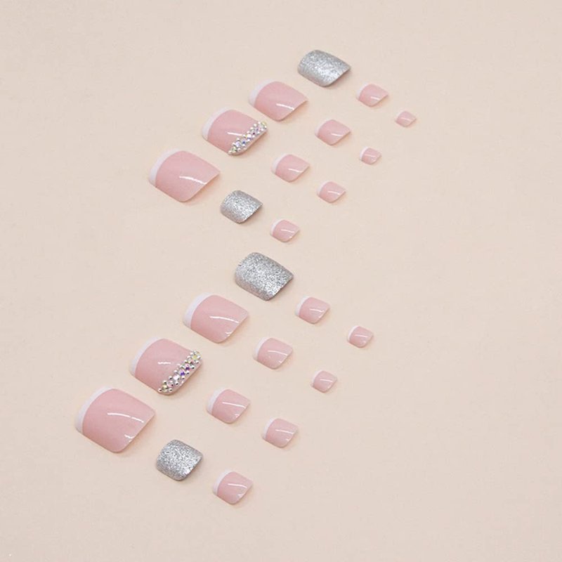 24 Pcs French Press on Toenails for Women Summer Short Toe False Nails Full Cover Toe nail Press on Fashion Nails Shiny Fake toenails Acrylic Diamond Design Glossy Silver Glitters Stick on Toenails