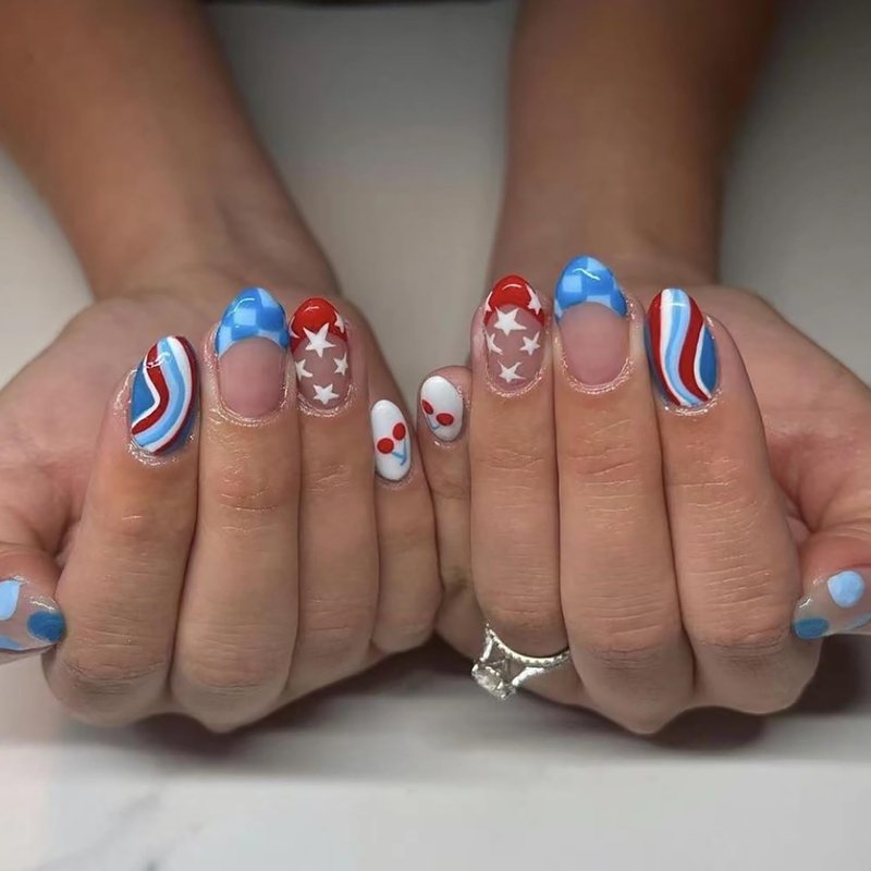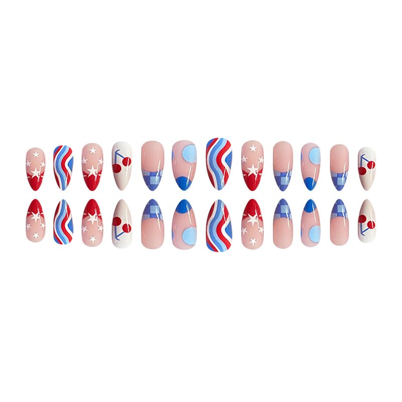 24 Pcs French Tip Press on Nails Medium Almond Fake Nails 4th of July False Nails with Star Cherry Pattern Design Gel Nails Press ons Patriotic Nails Acrylic Glue on Nails Artificial Nails for Women