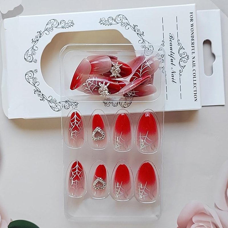 24 Pcs Ombre Red Press on Nails Short Almond - SHANRUN Halloween Fake Nails Press ons Nail Art Tips Glue on Nails Full Cover Acrylic False Nails with 3D Heart Spider Web Charms Design Stick on Nails
