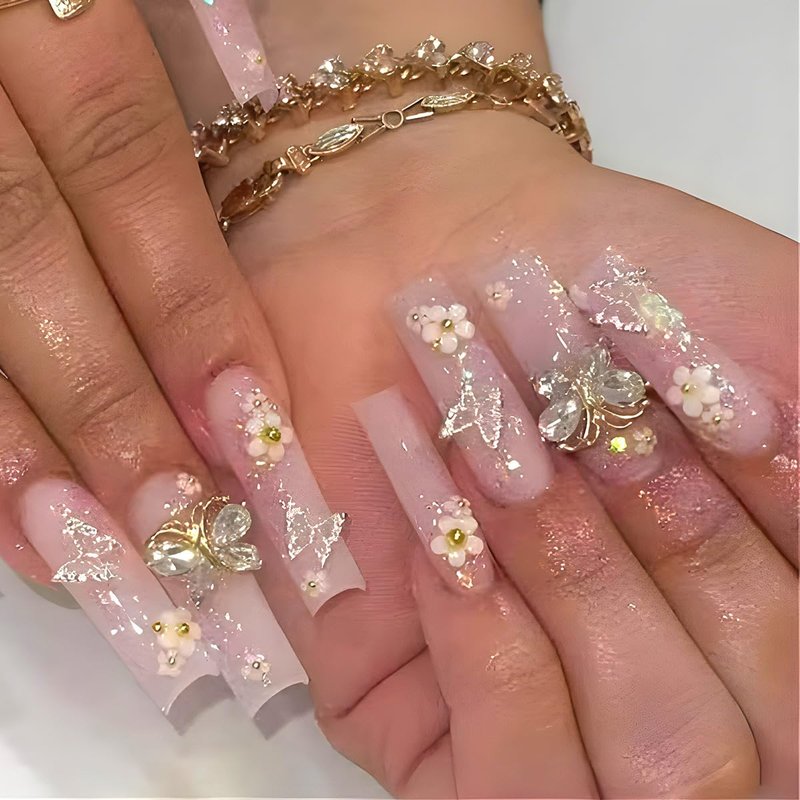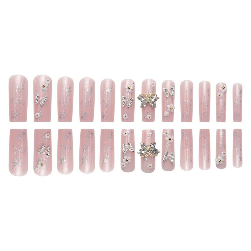 24 Pcs Pink Press on Nails Long Coffin Square - SHANRUN 3D Butterfly Glitter French Ballerina Fake Nails Press ons Nail Tips Full Cover Acrylic False Nail Art with Nail File Stick Jelly Glue on Nails