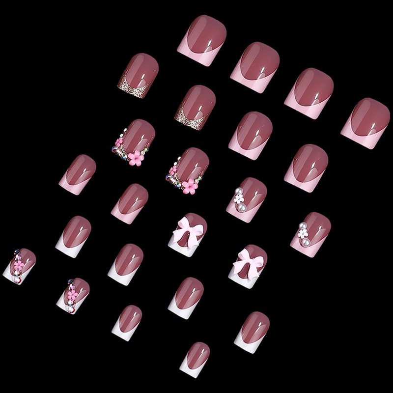 24 Pcs Pink Press on Nails Short Square - SHANRUN White French Fake Nails Press ons Nail Art Tip Glue on Nails Full Cover Artificial Acrylic False Nails Rhinestone Flower Bow Glitter Design for Women