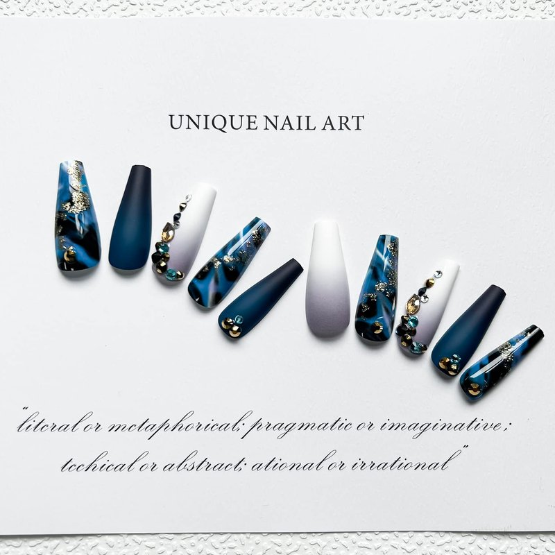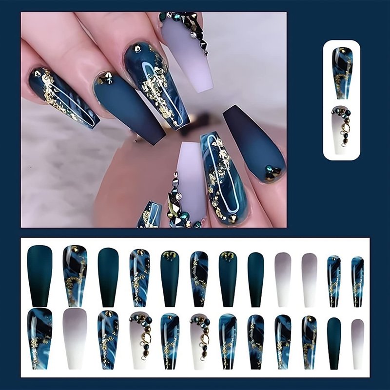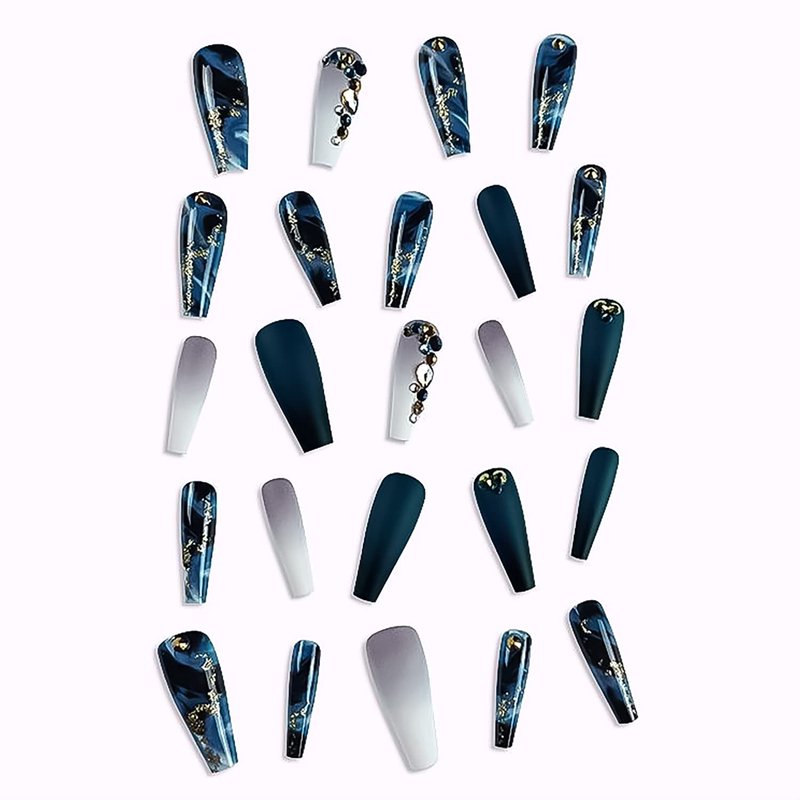 24 Pcs glossy and matte acrylic design coffin press on nails with dark blue