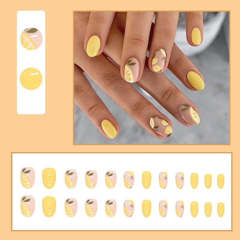 24 Pcs Press on Nails Short Fake Nails Oval Designs Full Cover False Nails with Lemon Pattern Yellow Acrylic Nails Glossy Glue on Nails for Women Nail Art Decoration