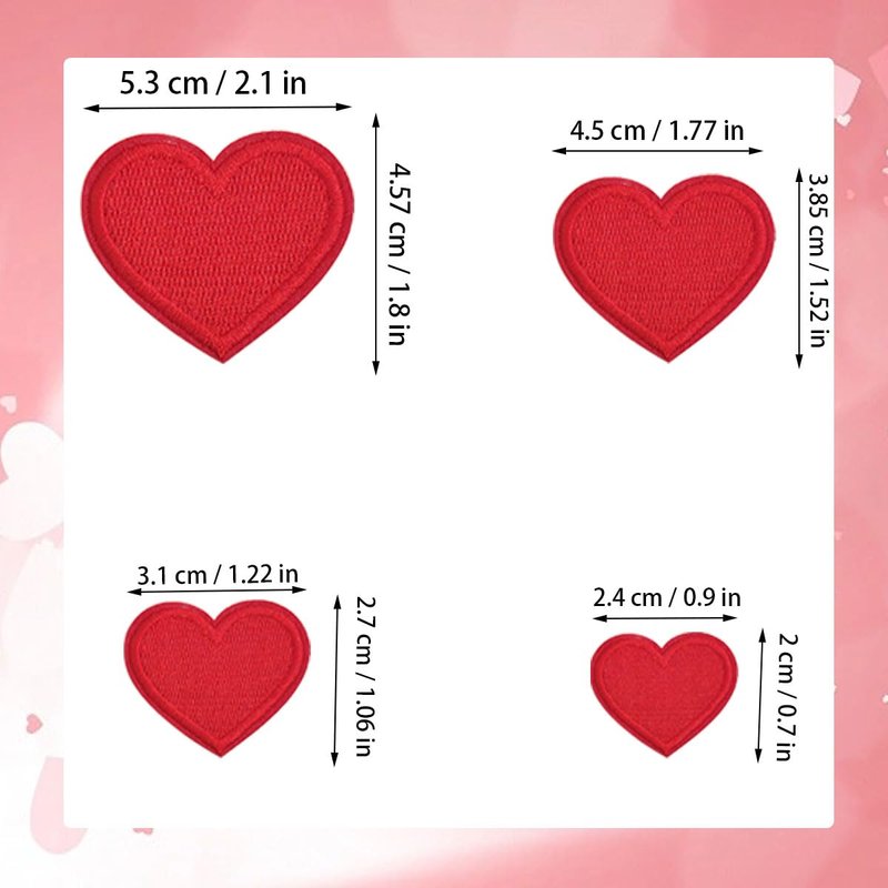 - Package Includes: This is a nice pack of red heart patch. you will get 24 red hearts patches, size of red heart patches are 2.1 x 1.8 in, 1.77 x 1.52 in, 1.22 x 1.06 in, 0.9 x 0.7 in, each of 6 pcs. different size can meet your most needs. the red heart iron on patch is very durable and washes well if you use it with the right way.