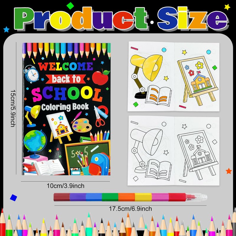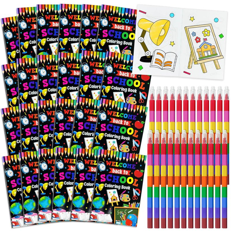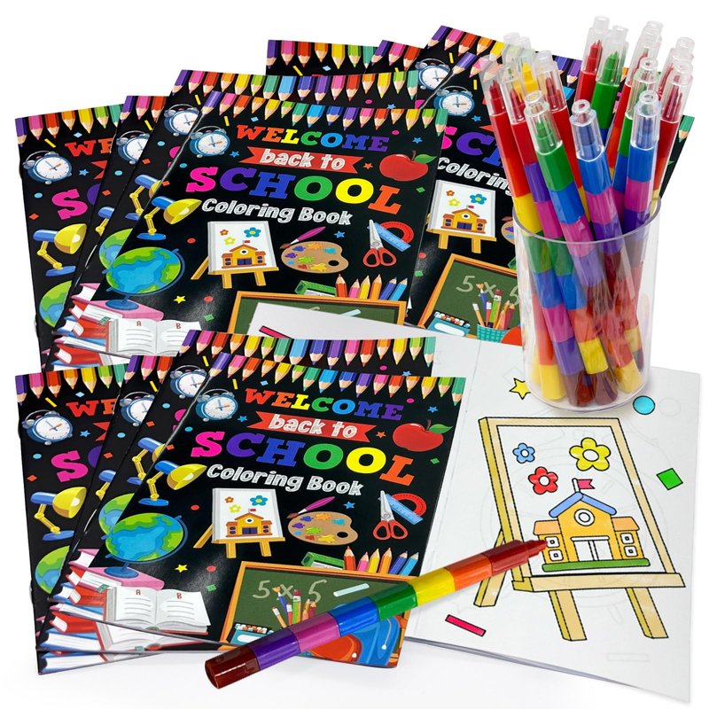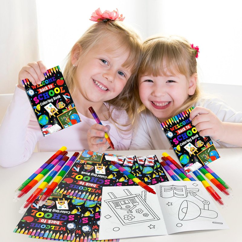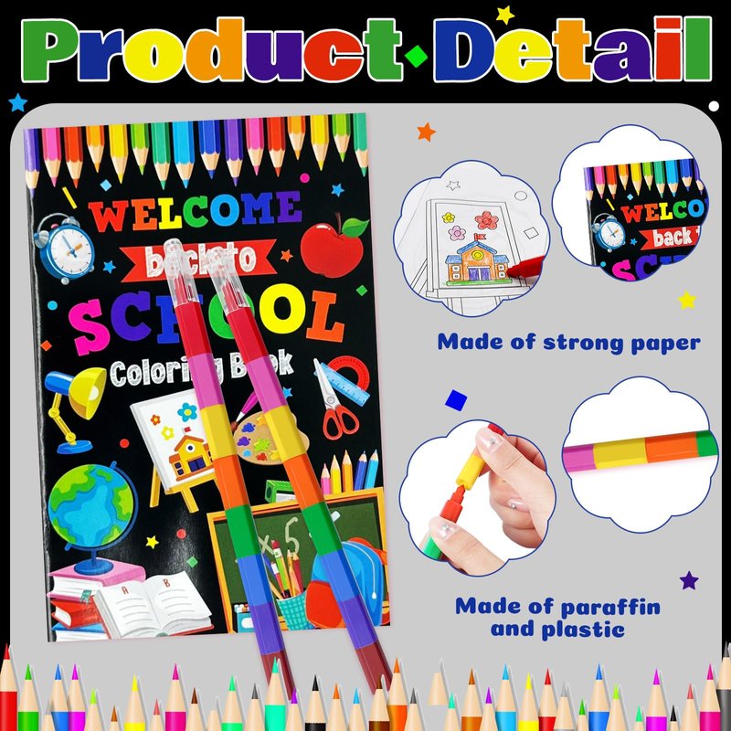 - Back To School Party Favors Set: our back to school coloring book with crayons bulk includes 24 coloring books(12 pages per book), 24 rainbow stacking crayons(8 colors),various styles enrich your school party