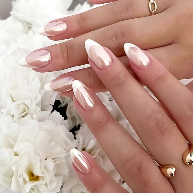 24 Pcs White French Tip Press On Nails Almond Medium Fake Nails Aurora Chrome False Nails Acrylic Glue On Nails Full Cover Stick On Nails Artificial Nails For Women Girls Manicure