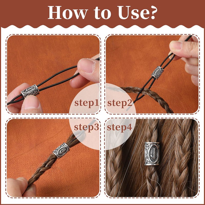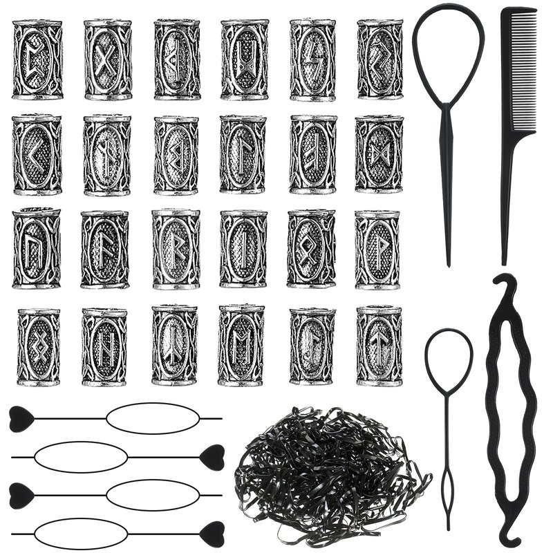 The package contains a set of 24 viking letter hair accessories, 4 pieces of small pull hair piercing pins and a large pull piercing pin set, in addition to several black hair loops, sufficient quantity can meet your needs.
